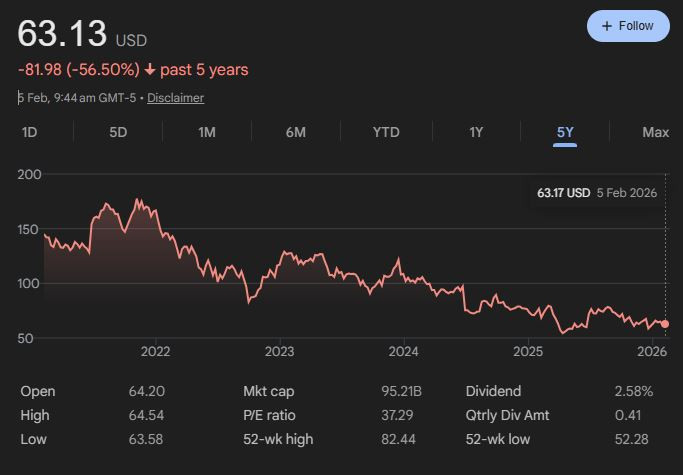 Shares of Nike are trading around $63, marking a sharp fall of more than 56% over the past five years and underscoring the challenges facing one of the world’s most recognizable athletic brands.