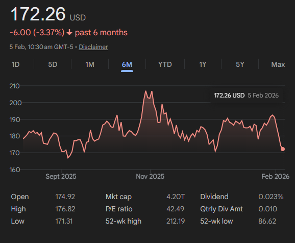 Nvidia shares fell again to $172.26, extending a six-month slide as investors reassess expectations surrounding artificial intelligence demand and the company’s elevated valuation. The pullback comes after a powerful multi-year rally that positioned Nvidia as one of the most valuable companies in the world.
