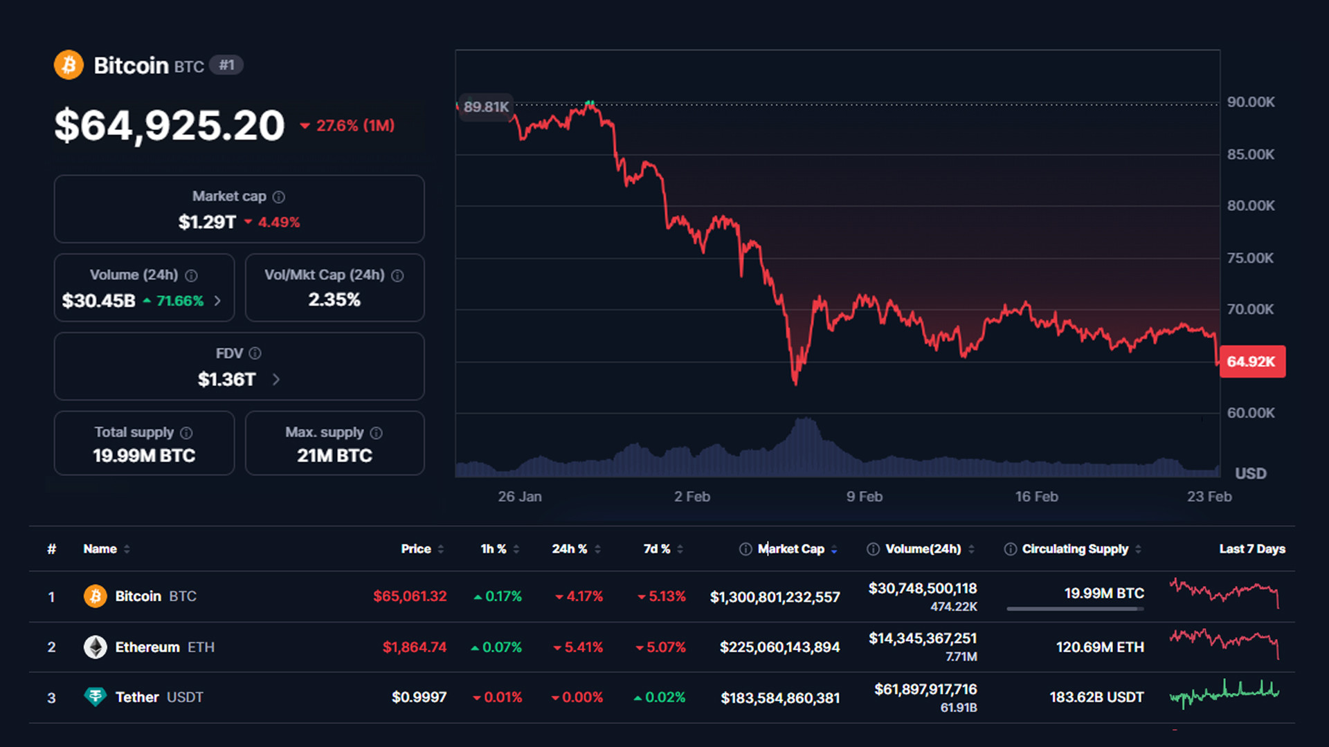 In New York trading late Monday, Bitcoin tumbled below the $65,000 mark, extending its recent slide as fresh tariff uncertainty from Washington weighed heavily on risk assets.
