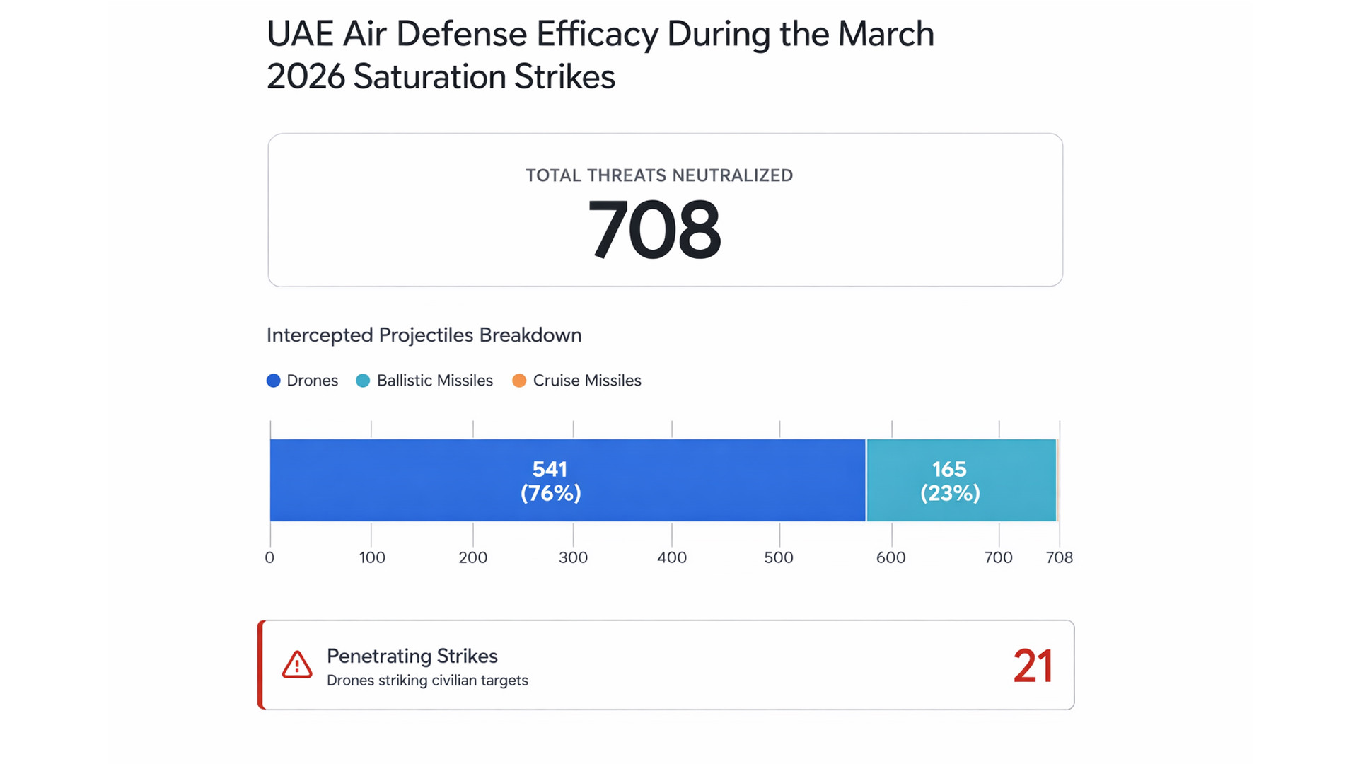 A defense performance graphic circulated by officials outlines the total volume of Iranian projectiles intercepted by UAE air and missile defense systems between February 28 and March 2, 2026.